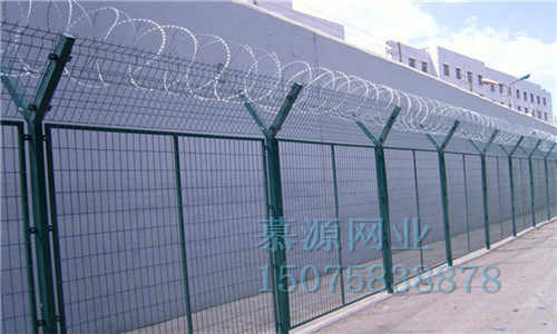 監獄鋼網墻用料:網高:1800-3000毫米,網寬2000-3000毫米。邊框:200x300mmx2.0mm,絲徑500mm,孔徑500x2000mm/700mmx1500mm,立柱:50*50*2.0毫米或60*60*2.5毫米方管,焊接成Y型, pvc浸塑處理或熱鍍鋅。Y型架上邊架蛇腹型刀刺:由熱鍍鋅鋼板或不銹鋼薄板沖壓出尖利的刀片狀,高張力鍍鋅鋼絲或者不銹鋼絲做芯線組合而成的阻盡器材。刀刺直徑采取50-60厘米,刀型整潔、刀片鋒利、排列均勻致密、連接堅固、防腐才能強,可能達到防攀越、防拆卸最高保險等級。